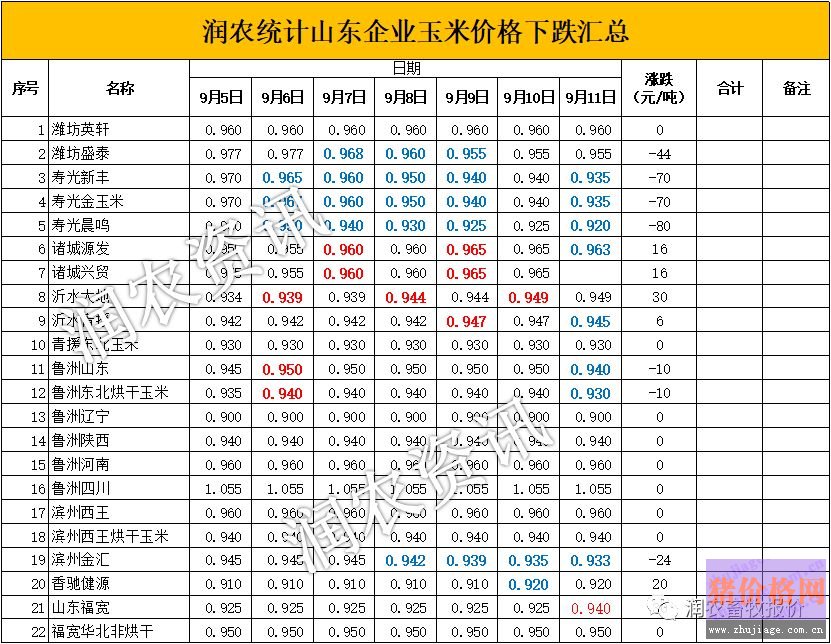 山东地区,新粮逐步上市,从9月5日到12日玉米价格走出一波下跌行情,幅度在50--80元之间。下跌主要集中在潍坊寿光地区,潍坊诸城地区价格略涨。后期新粮陆续上市,市场受到一定冲击,各企业到货量增大,市场需求趋缓,后期山东地区价格或仍将缓慢走低。