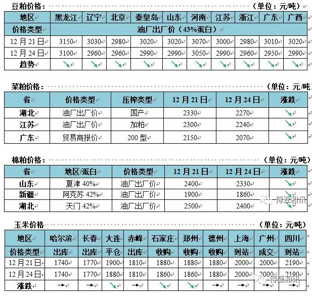 今日国内豆粕现货价格延续下跌,下跌幅度20-50元。国内进口大豆供应宽松,豆粕库存仍处于高位,因终端提货较慢和环保限产影响,油厂开机率持续保持偏低水平,中国下调杂粕进口关税,利空蛋白原料市场,油厂延续降价销售。非洲猪瘟延续扩散,叠加冬季疫病较多,中小散户提前出栏,猪料需求旺季不旺。操作建议:货少滚动补货,保持安全库存。