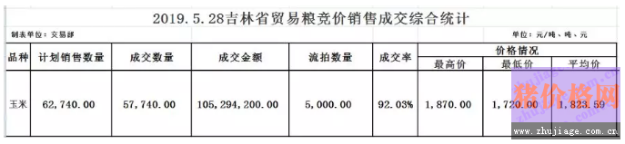 吉林省2019年5月28日贸易粮竞价销售交易结果:计划销售金额6.274万吨,成交5.774万吨,合计成交金额1.05亿元,成交率92.03%,平均成交价1823.59元/吨。