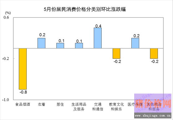 5月份,全国居民消费价格环比下降0.2%。其中,城市下降0.2%,农村下降0.1%;食品价格下降1.3%,非食品价格上涨0.1%;消费品价格下降0.2%,服务价格下降0.1%。