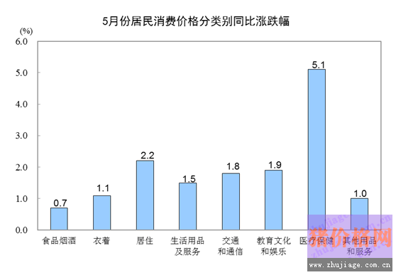 其他七大类价格同比均上涨。其中,医疗保健、居住、教育文化和娱乐价格分别上涨5.1%、2.2%和1.9%,交通和通信、生活用品及服务价格分别上涨1.8%和1.5%,衣着、其他用品和服务价格分别上涨1.1%和1.0%。