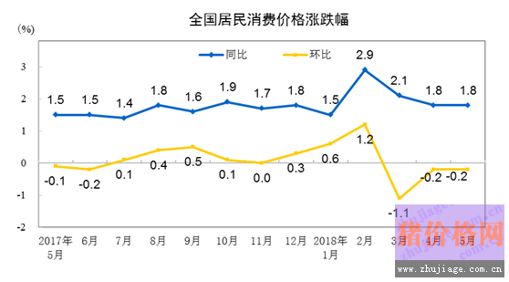 全国居民消费价格同比上涨1.8%。其中,城市上涨1.8%,农村上涨1.7%;食品价格上涨0.1%,非食品价格上涨2.2%;消费品价格上涨1.3%,服务价格上涨2.5%。1-5月平均,全国居民消费价格比去年同期上涨2.0%。