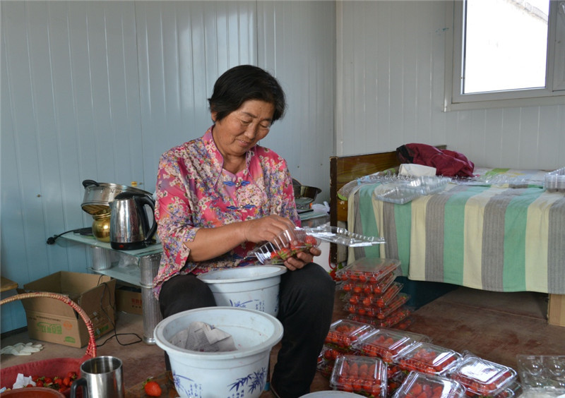 6月22日,兴胜店村村民杨春花在包装自家大棚种植的草莓。