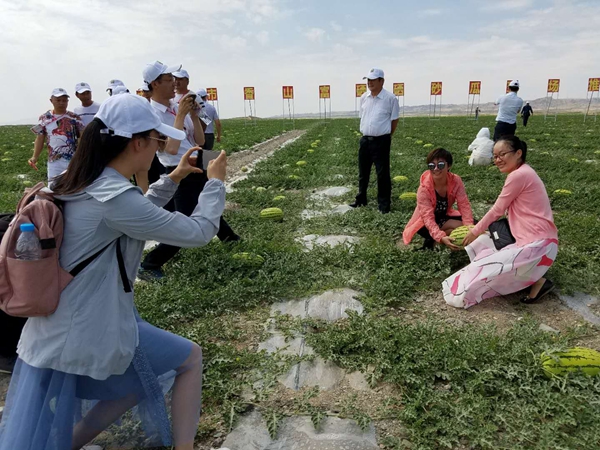 参会客商考察中卫市香山乡硒砂瓜园。中国农业新闻网记者冯建伟摄