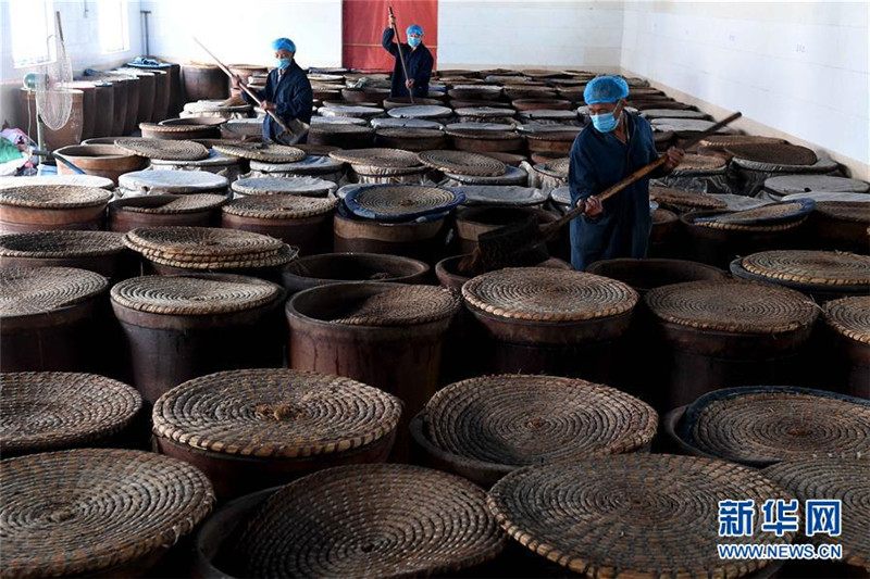 6月29日,在河南省温县武德镇亢村香乐醋厂扶贫车间,贫困户员工在搅拌醋糟。