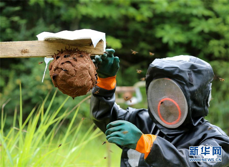 7月5日,融水县杆洞乡一家专业合作社成员穿着防护服查看野蜂生长情况。
