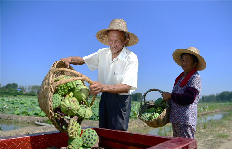 7月19日,在肥西县铭传乡桂树社区富绿家庭农场,农民收集采摘的莲蓬。