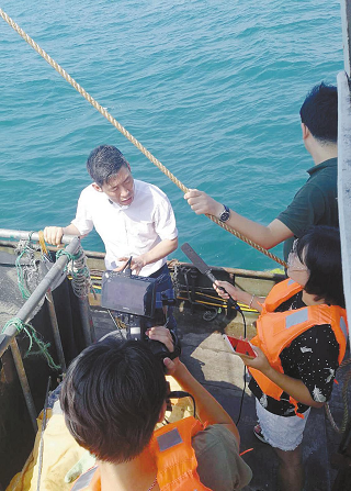 老尹家海参公司负责人尹宝昌在船上接受记者采访