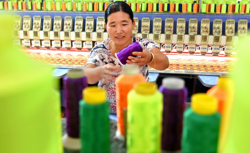 8月14日,在山东省淄博市沂源县石桥镇葛庄村,一名妇女在针织车间劳作。
