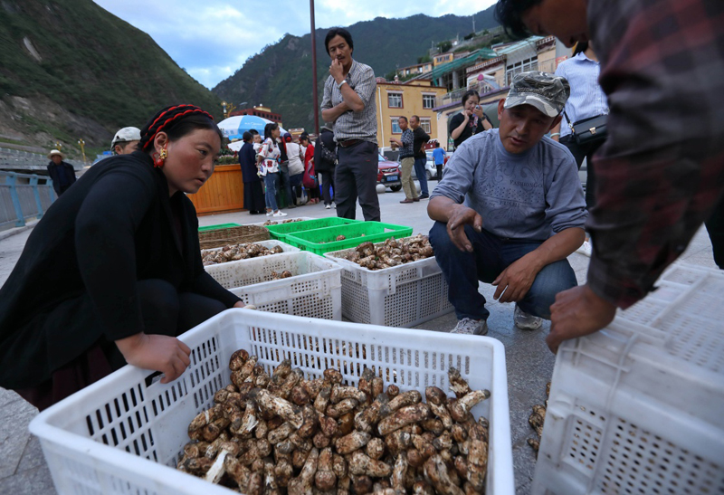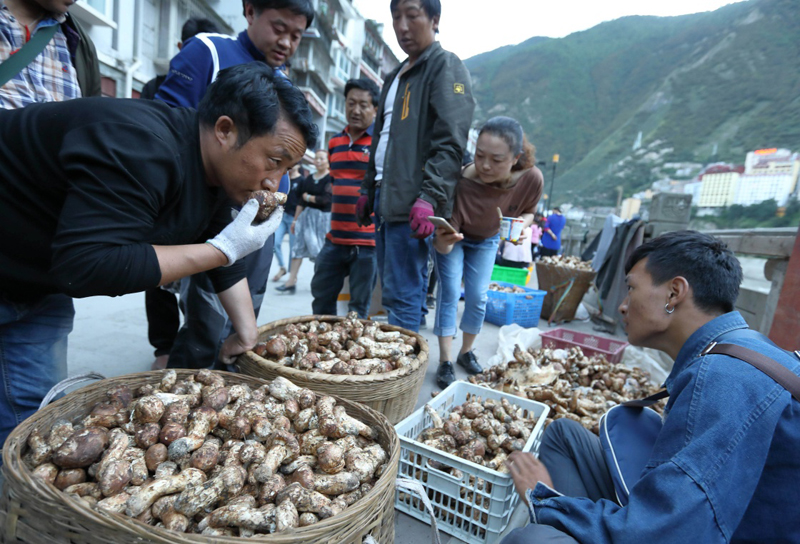 8月14日,在雅江县城,收松茸的客商(右二)与村民讨价还价。