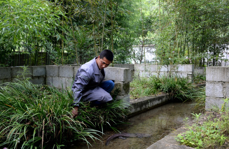 陕西宁陕县四亩地镇四亩地村荣庚生态脱贫产业园区内,技术人员在查看大鲵生长情况(8月17日摄)。