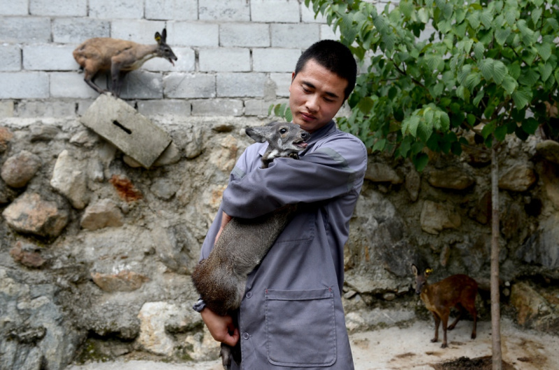 陕西宁陕县四亩地镇四亩地村荣庚生态脱贫产业园区内,技术人员在查看林麝生长情况(8月17日摄)。