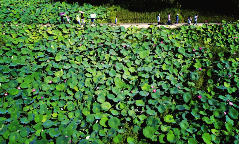 游人在陕西宁陕秦岭悠然山高山湿地景区欣赏荷花(8月19日无人机拍摄)。