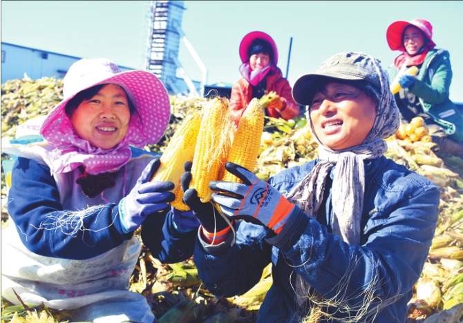 金秋九月,驱车行进在黑龙江省克东县乡村采访,随处可见农民忙着秋收的场面。在昌盛乡翻身村,刚刚走进天伟现代农机合作社大门,就看见院子里满地玉米堆成了一座座金灿灿的小山,几名农妇正围着玉米堆一边分拣一边拉家常,十分热闹。“这玉米棒子,又大又成实,一个虫眼都没有,长得多好啊!”“今年甜玉米丰收,不光棒子饱满,还特别甜呢!”“要我说这玉米再甜也没咱这日子甜,在家门口掰玉米棒,一天二百来块钱,干一个半月就是八九千,要是没有合作社咱们上哪儿找这好事呀!”姐妹们欢快、爽朗的笑声,让周围许多忙碌的社员竖起了大拇指。