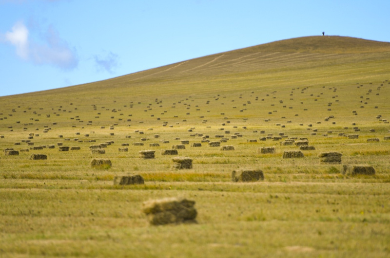 9月24日,在内蒙古锡林郭勒盟,已经打好的草捆绑成堆摆放在草原上。