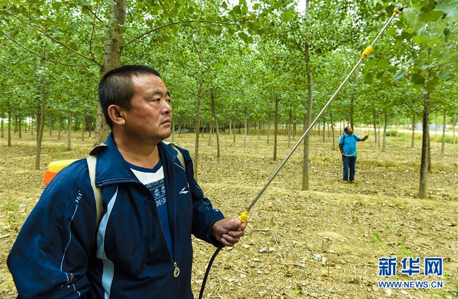 9月26日,通过扶贫专岗就业的贫困户在河北省故城县青罕镇南王庄村树林喷洒农药。