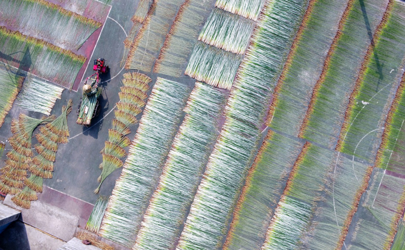 10月7日,六羊屯村民在晾晒蔺草(无人机拍摄)。