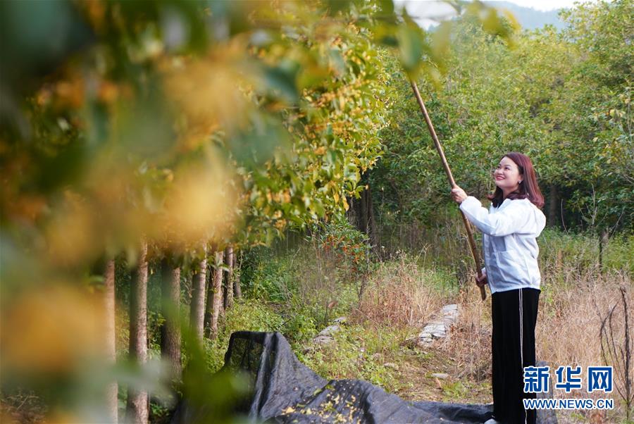 10月9日,工作人员在全南县赣江源生态经济示范园内采摘桂花。