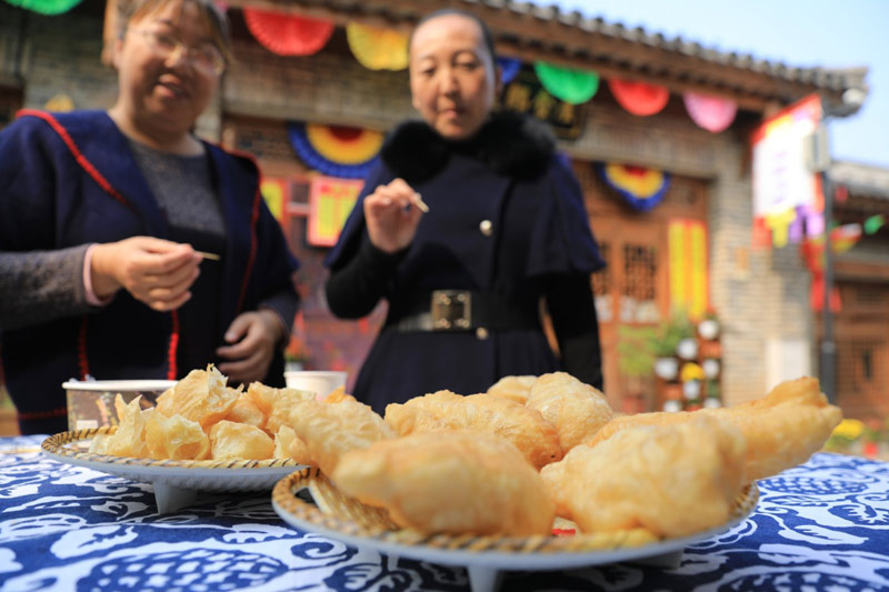10月17日,在河北省平山县红崖谷景区,游客品尝当地小吃——油鬼。新华社记者 赵丹惠 摄
