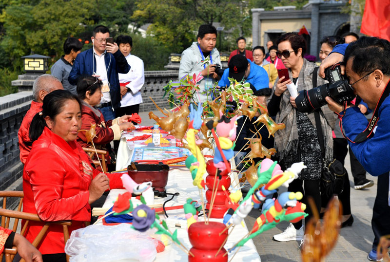 在河北省平山县李家庄,民间艺人为游客展示非遗技艺(10月12日摄)。新华社发(张震 摄)