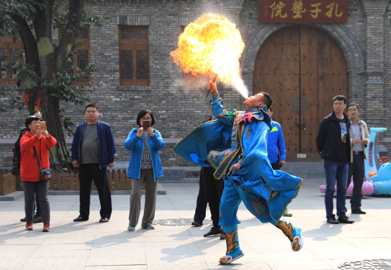 10月17日,在河北省平山县红崖谷景区,演员表演川剧喷火绝活。新华社记者 赵丹惠 摄