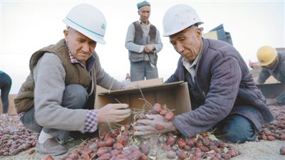 花园村村民把天然晾晒的红枣装箱。(资料图片)