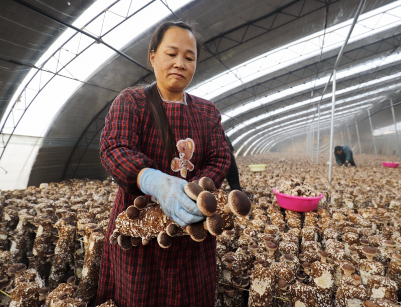 11月20日,在河北省遵化市一大棚内,农民在收获香菇。