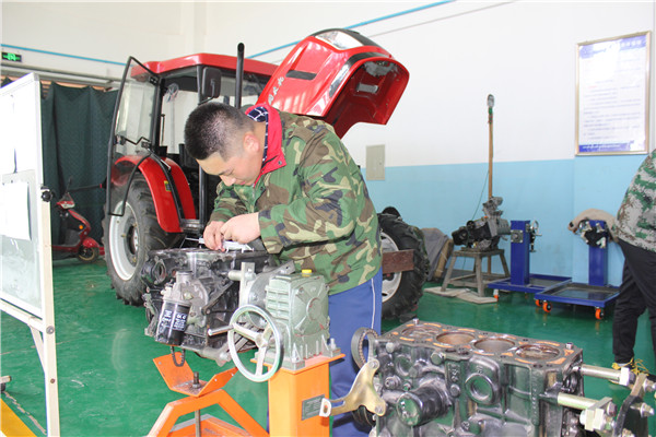 图为静宁县职教中心学生正在钻研农机修理技术