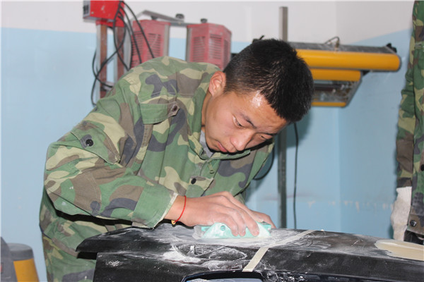 图为静宁县职教中心学生正在苦练汽车烤铆喷漆技术