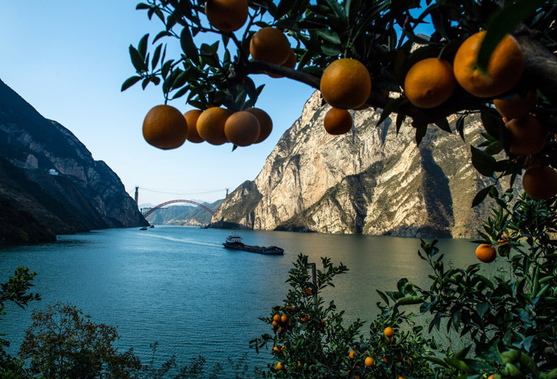11月25日,在秭归县兵书宝剑峡水域附近,货轮从结满果实的脐橙园前经过。