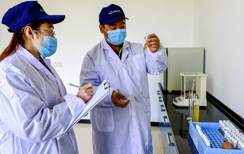 12月9日,河北省武强县一家生物科技公司的工作人员在化验室对处理过的污水进行水质检测。