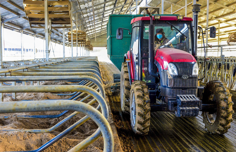 12月9日,河北省武强县一家养牛企业的工人在用机械抛撒牛卧床垫料。