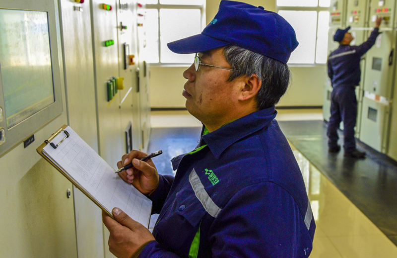 12月9日,河北省武强县一家生物科技公司的工作人员在配电室记录沼气发电数据。