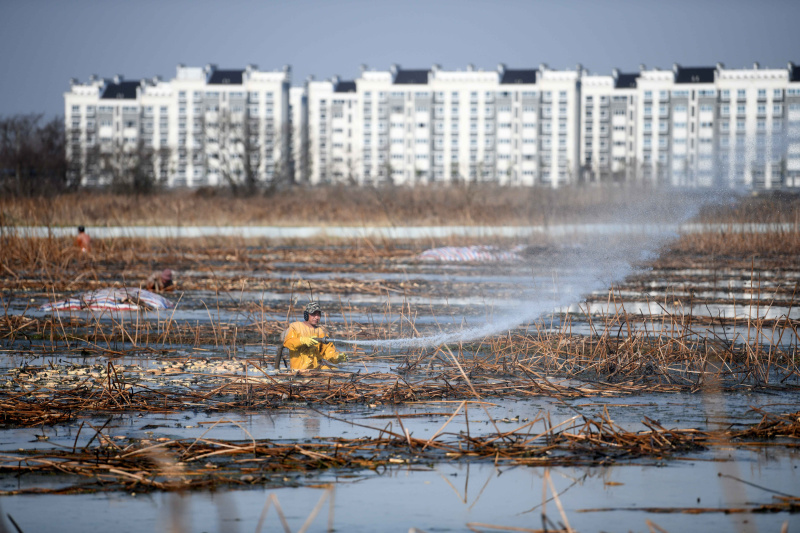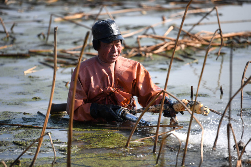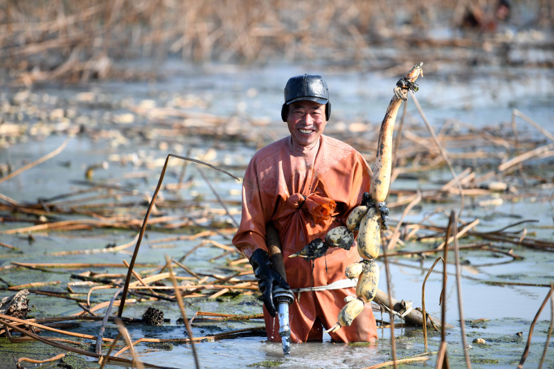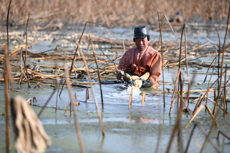 12月29日,来自淮南的挖藕人王公平在肥西县丰乐镇一莲藕种植基地收获莲藕。王公平每天泡在冰冷的水中劳动9个小时,挖藕约1000斤,获得酬劳约300元。