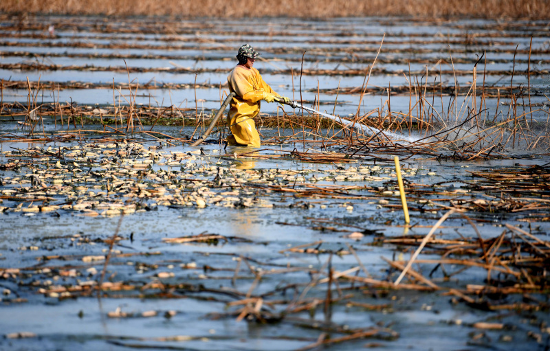 12月29日,来自淮南的挖藕人张作志在肥西县丰乐镇一莲藕种植基地用高压水枪冲掉冰层。