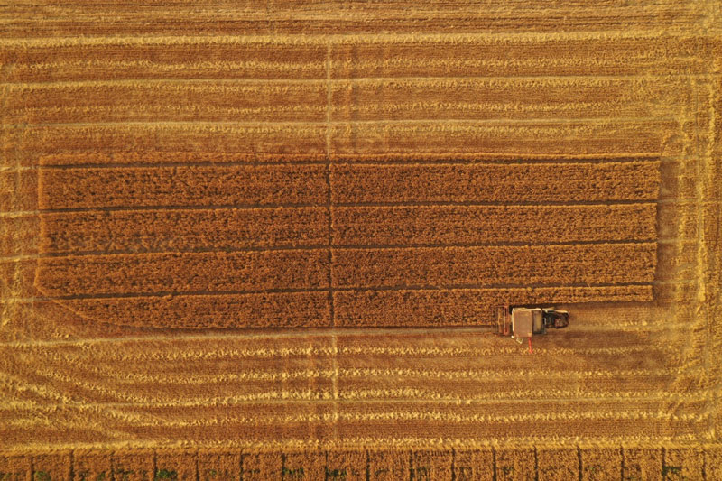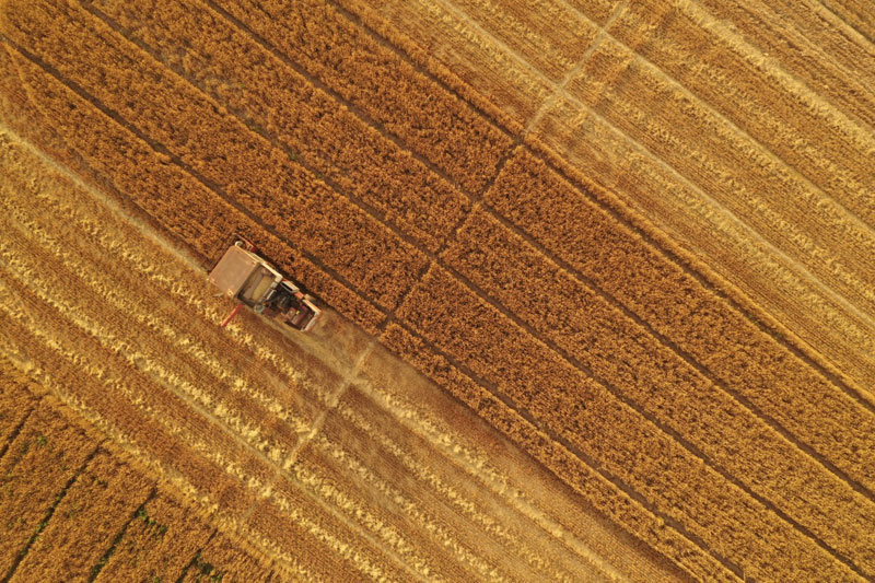 6月13日,雄安新区大王镇小王村村民在收获小麦(无人机拍摄)。新华社记者 邢广利 摄