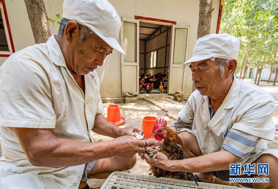6月26日,在河北省衡水市武邑县清凉店镇鲍贤兰村“跑步鸡”养殖基地内,工作人员给鸡苗佩戴计步脚环。