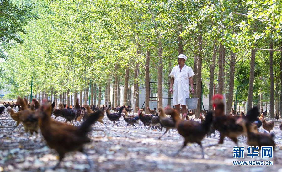 6月26日,在河北省衡水市武邑县清凉店镇鲍贤兰村“跑步鸡”养殖基地内,工作人员在放养柴鸡。