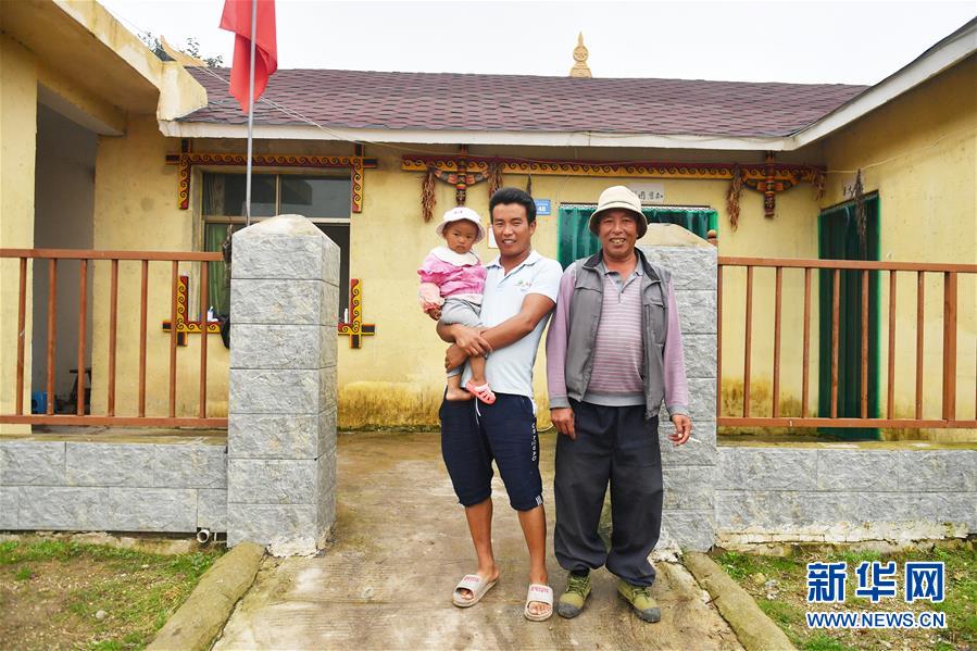 9月7日,彝海村村民阿说尔迫(左二)抱着孩子,与父亲阿说瓦格在自家院外留影。