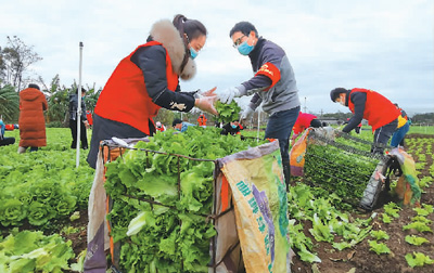 2月17日,广西柳州市柳江区进德镇政府组织志愿者,帮助四连村菜农一起采摘爱心菜,包括生菜、油麦菜、菜花等。由当地普通菜农捐赠的5吨爱心菜当天分别送往龙潭医院等一线防疫部门。图为爱心菜采摘现场。黎寒池摄(人民视觉)