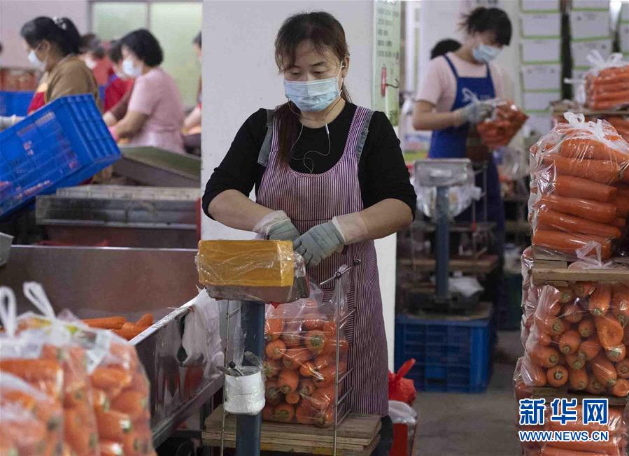 4月21日,在福建泉州南安市石井镇鑫冠禾农业开发有限公司,胡萝卜初加工生产线上的工人将洗净的胡萝卜装袋。