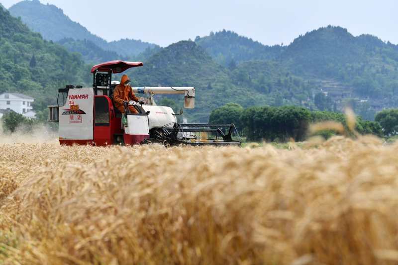 5月以来,贵州省铜仁市思南县多个乡镇种植的1.48万亩冬小麦陆续进入开镰收割期,农户们抓住晴好天气抢收小麦,确保颗粒归仓。新华社记者 杨文斌 摄