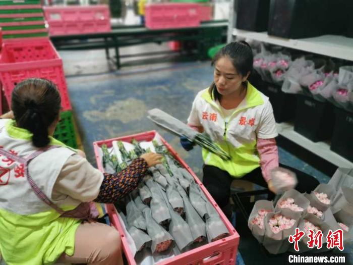 图为工人将鲜切花包装转运,这批鲜切花将通过铁路冷链运输。 中国铁路昆明局集团供图 摄