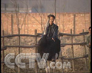 原来,徐少云打算建一个农庄,他一有空就用这种办法训练鸵鸟和人的亲近感。但是每次骑鸵鸟也很不容易。被踢伤是常有的事。