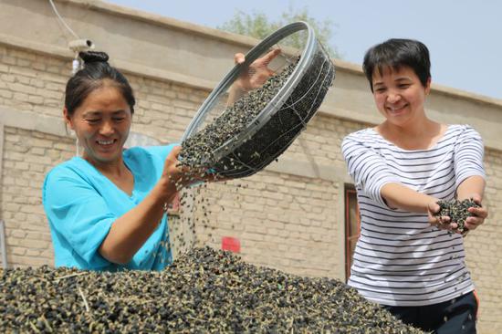 今年邓金涛迎来丰收年,目前黑枸杞已经摘收,村工作队帮助筛选、分级、晾晒,邓金涛种种植的黑枸杞质量上乘,成为其盖喀什村的黑枸杞种植大户。今年40亩黑枸杞,亩产量可以达到100公斤,收入达20余万元。