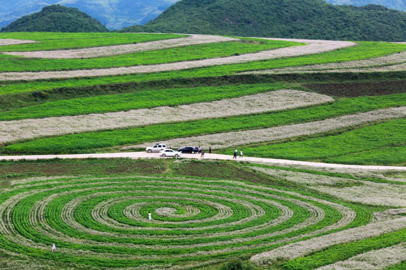 7月12日,游客在贵州威宁板底乡雄鹰村观赏荞麦花。