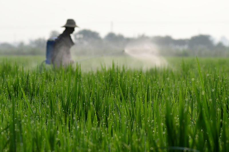 8月2日,安徽省肥西县丰乐镇三里村农民在水稻田间喷洒农药。