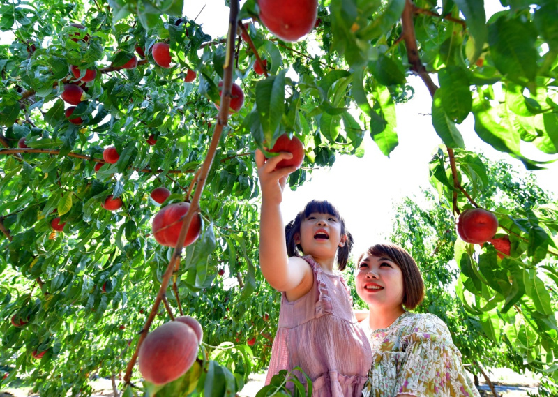 7月1日,游客在滦州市九百户镇九百户村鸡冠山生态农业产业园摘桃。