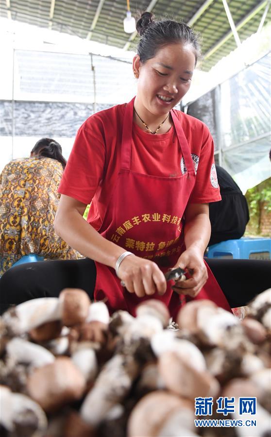 8月6日,工人在丘北县双龙营镇新沟农场种植基地修剪采摘的姬松茸。