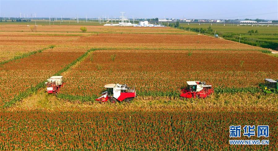 9月4日,农民操作收割机在阜城县崔家庙镇红高粱种植基地收割酿酒高粱(无人机拍摄)。